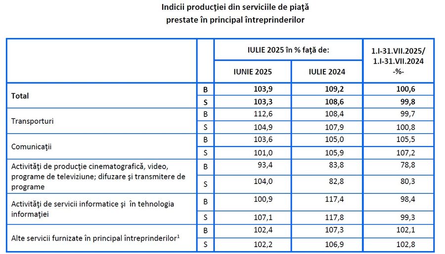 In luna iulie 2025, comparativ cu iunie 2025, cifra de afaceri din serviciile de piata prestate in principal intreprinderilor, serie bruta, a crescut, pe ansamblu, cu 3,9%, datorita majorarii rulajului din activitatile de transporturi (+12,6%), comunicatii (+3,6%), alte servicii furnizate in principal intreprinderilor (+2,4%) si activitatile de servicii informatice si in tehnologia informatiei (+0,9%). Activitatea de productie cinematografica, video, programe de televiziune; difuzare si transmitere de programe a inregistrat o scadere cu 6,6%. Ca serie ajustata, indicatorul privind cifra de afaceri din serviciile de piata prestate in principal intreprinderilor a crescut, pe ansamblu, cu 3,3%.