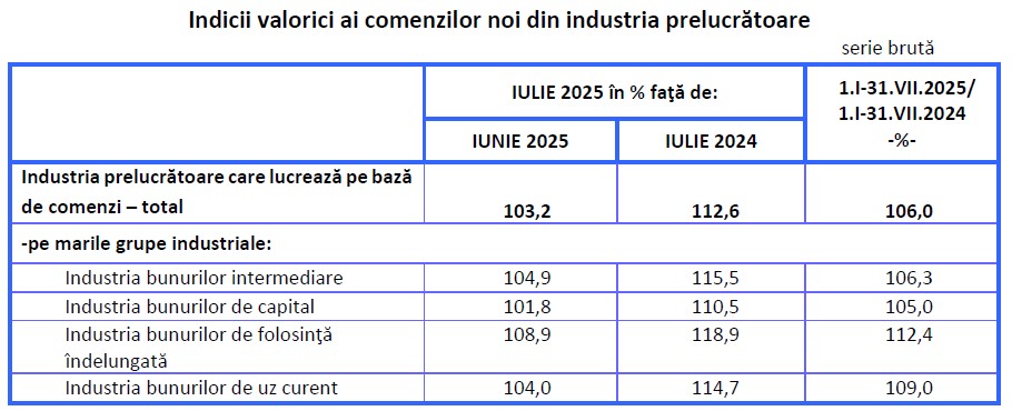 In primele 7 luni ale anului in curs, raportat la perioada corespunzatoare din 2024, comenzile noi din industria prelucratoare au crescut in termeni nominali, pe ansamblu, cu 6%, datorita cresterii inregistrate in industria bunurilor de folosinta indelungata (+12,4%), a bunurilor de uz curent (+9%), in industria bunurilor intermediare (+6,3%) si cea a bunurilor de capital (+5%).