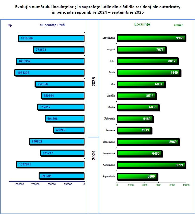 In luna septembrie 2025 s-au eliberat 3.598 autorizatii de construire pentru cladiri rezidentiale (+2,6% fata de luna august 2025), cu o suprafata utila totala de 1.010.660 mp (+29,8%). Din totalul autorizatiilor de construire pentru cladiri rezidentiale 69,7% sunt pentru zona rurala. In luna septembrie 2025 se evidentiaza o crestere a numarului de autorizatii de construire eliberate pentru cladiri rezidentiale comparativ cu luna precedenta (+91 autorizatii). In profil teritorial, aceasta evolutie este reflectata in regiunile Nord-Est (+100 autorizatii), Sud-Est (+47), Bucuresti-Ilfov (+44), Sud-Vest Oltenia si Nord-Vest (+29 fiecare). Scaderi s-au inregistrat in Centru (-110 autorizatii), Vest (-42) si Sud-Muntenia (-6).