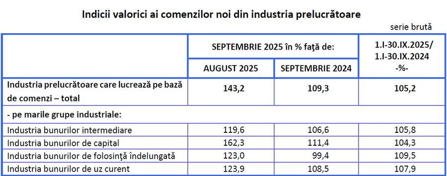 Comenzile noi din industria prelucratoare au crescut in termeni nominali, in septembrie 2025, comparativ cu luna precedenta, pe ansamblu, cu 43,2%, datorita evolutiilor inregistrate in industria bunurilor de capital (+62,3%), industria bunurilor de uz curent (+23,9%), a bunurilor de folosinta indelungata (+23%) si in industria bunurilor intermediare (+19,6%), potrivit celor mai recente date publicate de Institutul National de Statistica (INS). Datele statistice confirma evolutia comenzilor din industria prelucratoare, un indicator important pentru activitatea producatorilor locali. In primele noua luni ale anului, dinamica comenzilor arata o tendinta ascendenta care intareste pozitia industriei prelucratoare din Romania intr-un context economic volatil.