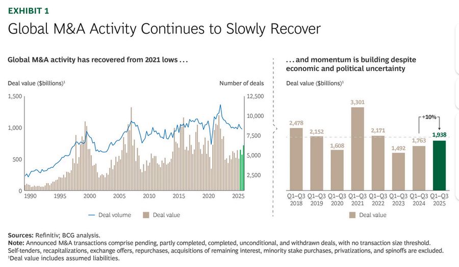 Home - Stiri - Afaceri, Juridic, Finante & Impozite - BCG: Activitatea globala de M&A revine pe crestere in primele noua luni din 2025