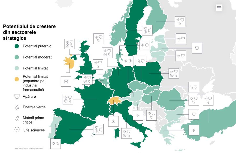 Cererea pentru spatii industriale si logistice in Europa, inclusiv Romania, va creste semnificativ in urmatorii ani, impulsionata de investitiile strategice in aparare, energie verde, materii prime critice pentru sectorul tehnologic, si in domeniul cercetarii si inovarii, potrivit raportului ”Opportunities for Industrial Real Estate in Europe – Strategic Sector Signals”, realizat de Cushman & Wakefield.Raportul evidentiaza transformarile majore care modeleaza piata imobiliara industriala pe fondul noilor politici de securitate, sustenabilitate si rezilienta a lanturilor de aprovizionare. In acest context, Romania se pozitioneaza ca un actor-cheie in Europa Centrala si de Est, beneficiind de investitii semnificative de o crestere accelerata a cererii pentru spatii industriale si logistice.