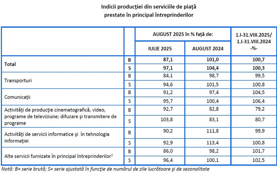 In luna august 2025, comparativ cu iulie 2025, cifra de afaceri din serviciile de piata prestate in principal intreprinderilor, serie bruta, a scazut, pe ansamblu, cu 12,9%, ca urmare a scaderilor rulajului din activitatile de transporturi (-15,9%), alte servicii furnizate in principal intreprinderilor (-14%), activitatile de servicii informatice si in tehnologia informatiei (-9,8%), activitatile de comunicatii (-8,8%) si activitatile de productie cinematografica, video, programe de televiziune; difuzare si transmitere de programe (-7,3%). Ca serie ajustata, indicatorul privind cifra de afaceri din serviciile de piata prestate in principal intreprinderilor a scazut, pe ansamblu, cu 2,9%.