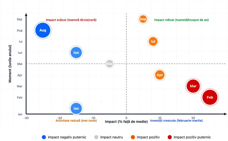 • Februarie–martie: cresteri de 35–40% fata de medie, stimulate de noi bugete si granturi europene.