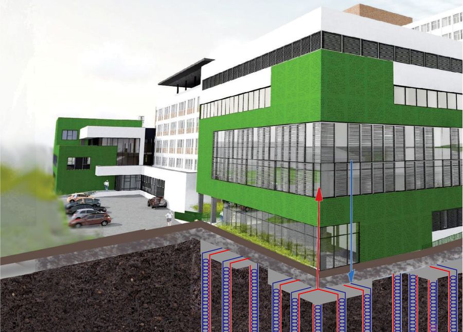 • extinderea corpului B al ambulatoriului Spitalului Clinic Judetean de Urgenta Oradea - Etapa I si Etapa II – instalatii HVAC cu pompe de caldura geotermale avand ca sursa primara de caldura pilotii energetici pe care s-a fundat cladirea;