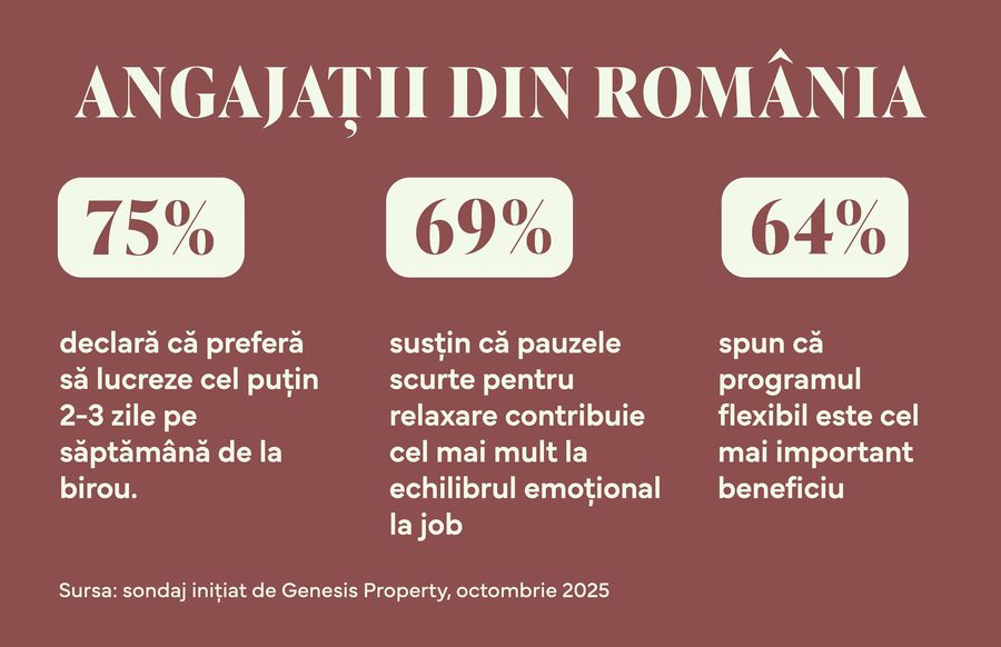 "Intr-un climat marcat de neliniste si schimbare, biroul redevine un reper de echilibru si siguranta emotionala. Este mai mult decat un loc pentru desfasurarea activitatii profesionale, este un spatiu care le ofera oamenilor stabilitate, sens si o forma de sprijin reciproc mai ales in momente in care incertitudinea legata de venituri, cariera sau contextul social sunt surse majore de stres. Biroul aduce ritm, relatii autentice si sentimentul ca apartii unui scop comun. Iar acest lucru are o valoare profunda, greu de cuantificat, dar esentiala pentru starea de bine si pentru energia colectiva a unei organizatii”, spune Elena Panait, Head of Leasing & ComYunitY la Genesis Property.